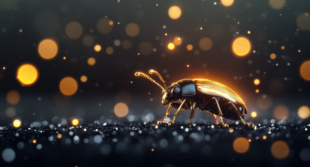 A luminescent insect stands on textured dark soil, surrounded by softly glowing particles, creating a magical atmosphere during twilight. The intricate details of its body catch the fading light beautifully.