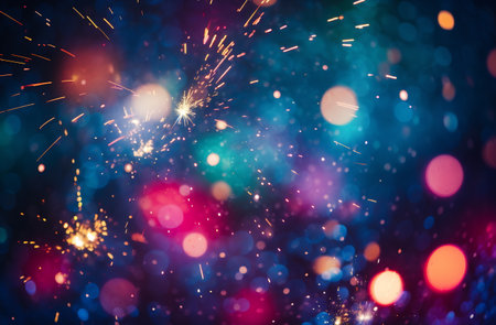A sparkling abstract glitter background illuminated by fireworks, evoking the joy of holiday celebrations like Christmas Eve or th of July with bursts of color.