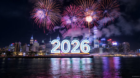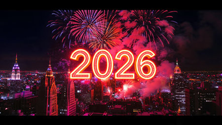 A vibrant scene with shimmering numerals and colorful fireworks illuminating the night sky, capturing the festive spirit of ringing in a new year.