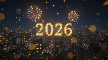 Happy new year 2026 written with Sparkle firework and bokeh background