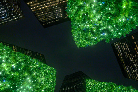Toronto, ON, Canada - December 20, 2025: Skyscrapers in Toronto's financial district draped in festive green lights, creating a unique urban Christmas atmosphere at night