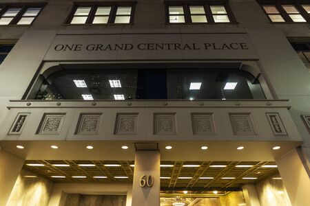 New York City, USA - August 1, 2018: Entrance of the One Grand Central Place (formerly known as the Lincoln Building) at night in Manhattan, New York City, USA