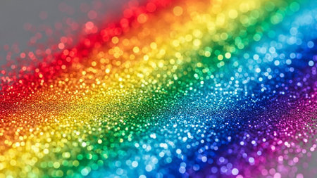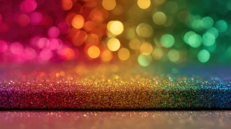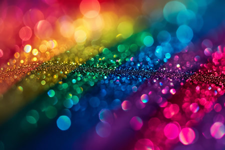 presents a vivid rainbow gradient of sparkling glitter, creating a and festive background. Soft, out-of-focus bokeh circles of light are scattered across the surface, adding a dreamy and ethereal The colors transition smoothly from red through orange, yellow, green, blue, and purple, evoking a sense of joy and celebration. The fine texture of the glitter is visible, contributing to the overall shimmering and luminous effect.