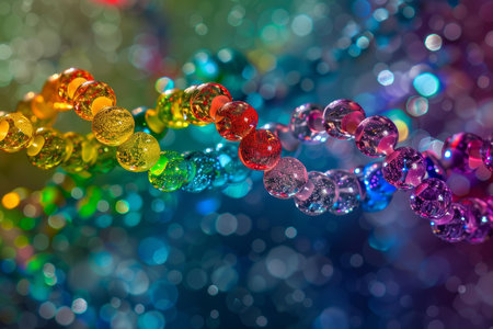 Closeup of a string of sparkling multicolored beads against a defocused light backdrop