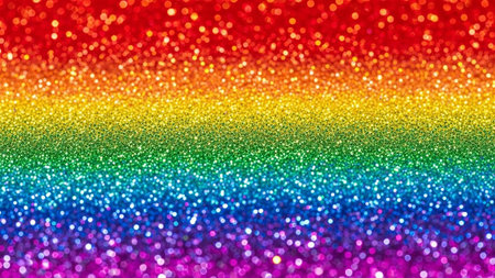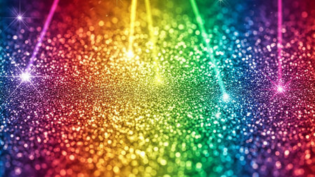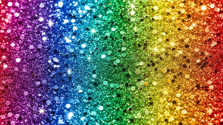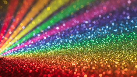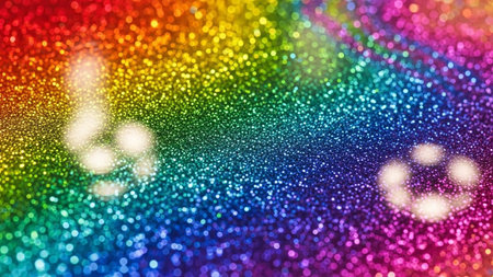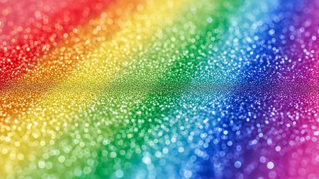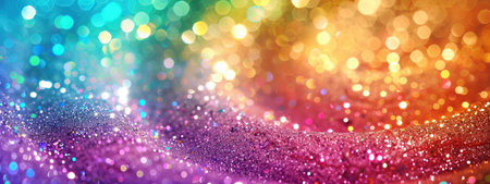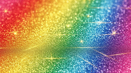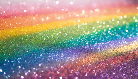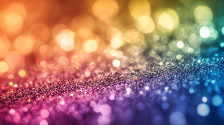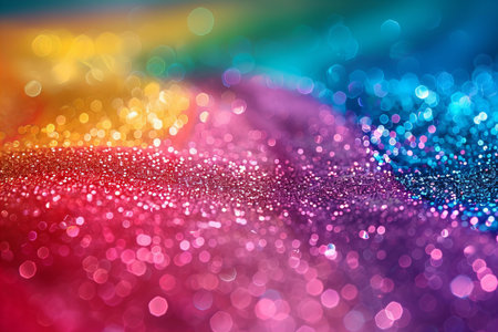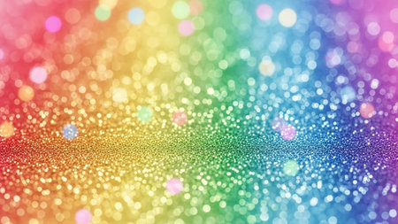 A and vibrant background featuring a spectrum of rainbow colors rendered in shimmering glitter. Softly focused, out-of-focus circles of light, known as bokeh, are scattered across the adding a magical and festive atmosphere. The overall effect is luminous and dreamy, evoking feelings of joy and celebration. The texture of the glitter creates a rich and sparkling surface.