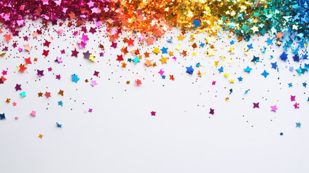 Rainbow colored confetti stars cascading on white backdrop, perfect for celebrations and festive occasions. Ai generated