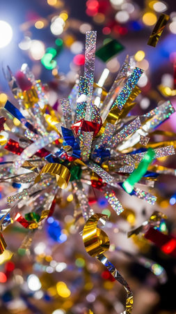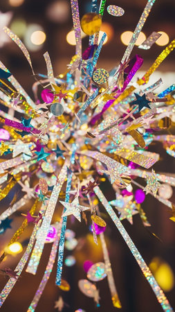 Bright showing close up macro shot of a burst of colorful metallic confetti streamers and glitter exploding outwards with bokeh lights in the background creating a...