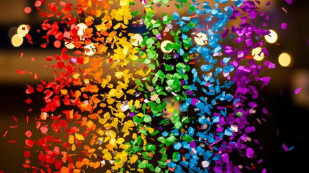 A dynamic explosion of rainbow colored confetti fills the frame with vibrant hues and scattered pieces, set against a soft bokeh background of blurred lights.