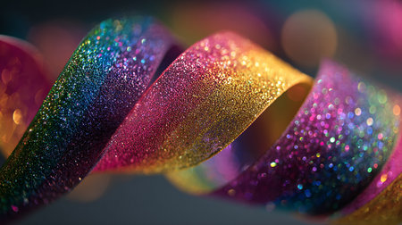 diagonal stripes of rainbow-colored glitter, creating a visual effect. The glitter particles are highly reflective, producing a soft bokeh of light that enhances the shimmering The background is a neutral gray, allowing the vibrant colors of the glitter to stand out prominently. The composition suggests a celebratory or festive mood, with a focus on light and color.