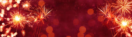 New Year's Eve, Silvester background panorama banner long - Firework on red texture with bokeh lights and space for text