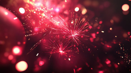 Bright fireworks burst in various colors against a deep red background, creating a vibrant atmosphere of celebration. Soft bokeh lights enhance the festive feel as joy fills the air.