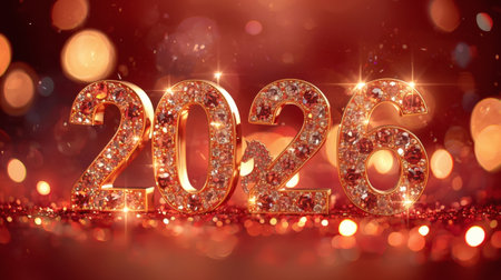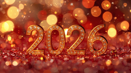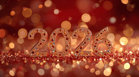 A stunning representation of the year 2026 featuring sparkling glitter numbers amidst a vibrant red bokeh background. Perfect for new year celebrations!