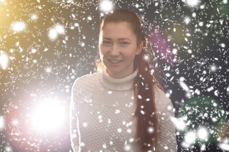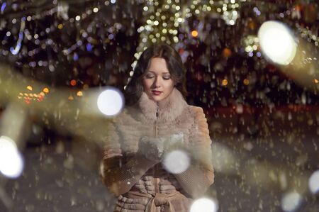Woman catching snowflakes on a snowy Christmas night