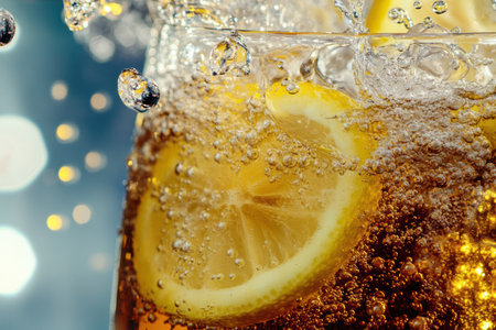 A vibrant image featuring a cold glass of soda filled with ice, surrounded by colorful confetti and illuminated by decorative bokeh lights, embodying a festive mood.