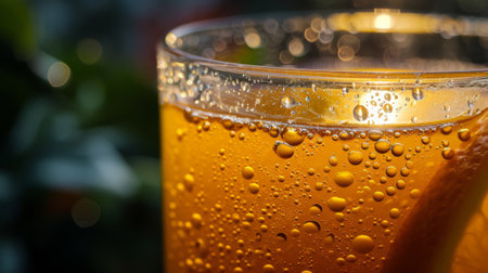A macro close-up of fizzy drink bubbles sparkling under warm sunlight, creating a refreshing and dynamic visual.