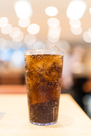 A fizzy soft drink with ice cubes on a bokeh background