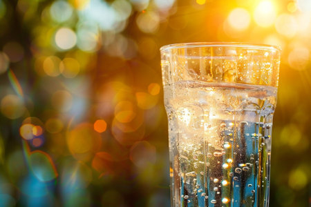 A glass of sparkling water with bubbles and bokeh background.