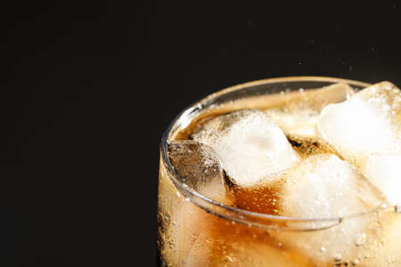 Chilled glass of cola drink with ice cubes isolated on dark background.