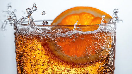 Refreshing glass of cola with ice cubes and orange slice surrounded by splash, capturing energy and brightness. Perfect for beverage, advertising and food industry