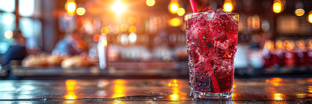 A glass of red drink with ice and a straw is placed on a bar counter, ready to be enjoyed. The vibrant drink catches the eye in a lively setting