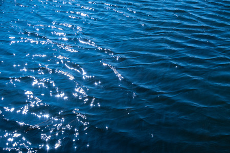 Close up of blue water surface with ripples and sun light.
