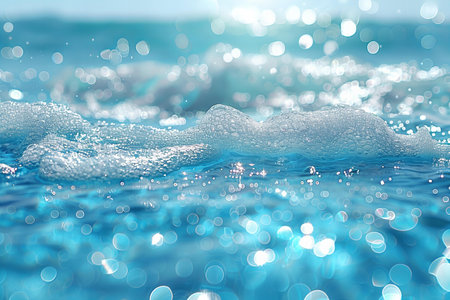 Close-up view of ocean waves shimmering with sunlight. Bokeh effect adds depth, enhancing the natural beauty and serene quality of the vast ocean landscape.
