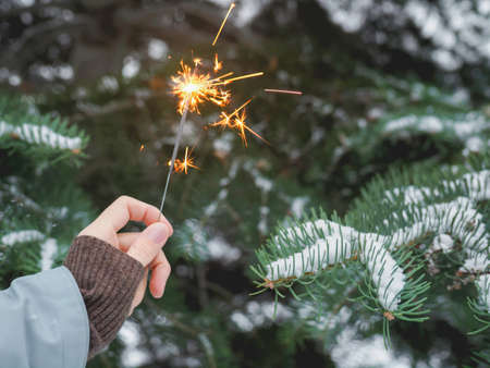 Hand in cozy mitten holding burning sparkler on background of pine tree branches in snow. Happy New Year! Atmospheric magic moment. Woman hand with glowing firework in evening.