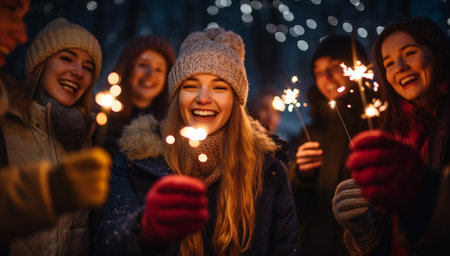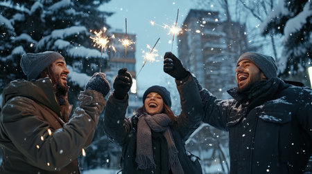 Group of happy friends celebrating new year's eve with sparklers in the snow and evening. Diverse group of young cheerful friends having fun. Happy New Year concept Party