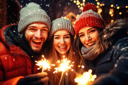 Portrait of happy friends smiling at camera standing outdoors with sparklers in their hands and having fun during winter holidays