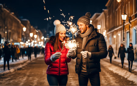Young couple holding sparklers in the city at night. Christmas and New Year concept.