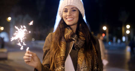 Pretty young woman in warm stylish winter fashion celebrating with a sparkler outdoors in an urban square looking at the camera with a lovely friendly smile.