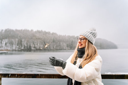 young woman holding sparkler by snowy lake.