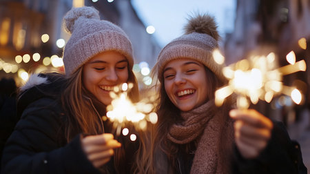 Two joyful friends celebrate a winter festival, surrounded by sparkling snowfall, enjoying the magic of the season together in festive attire.