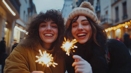 Photo of two women with Bengal lights on winter walk on background of decorated spruce