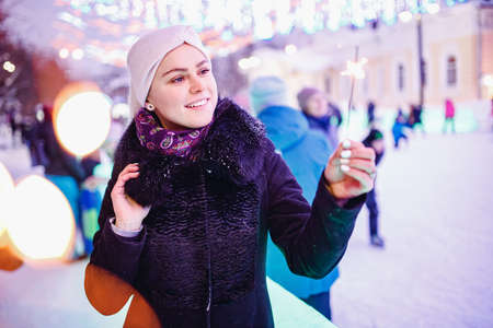 Happy young woman with winter clothes smiles lights sparklers, background evening city illumination. Christmas concept