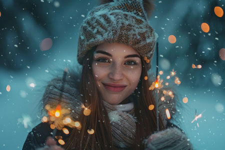 A close-up portrait of a beautiful woman with striking blue eyes, bundled in a warm, oversized knit sweater. She's holding a bright sparkler, its light illuminating her face, creating a magical and festive winter atmosphere. Snow dusts her hair, adding to the enchanting scene.