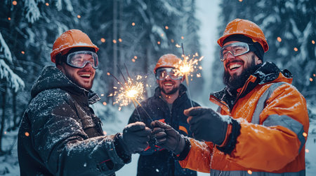 Engineers smiling and holding sparklers in winter gear, celebrating a job well done in a snowy setting
