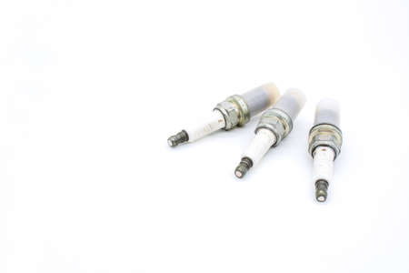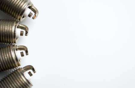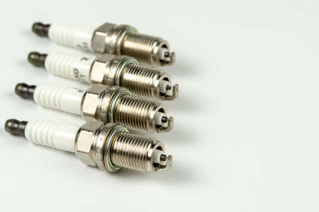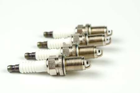 Car spark plugs on white background. Car spare parts.