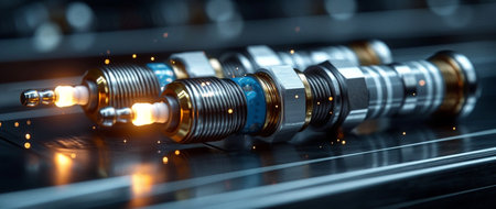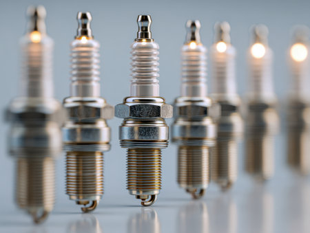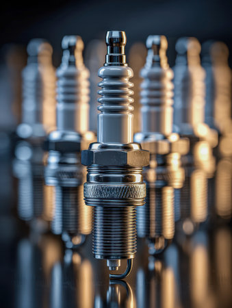 A sleek alignment of gleaming engine components highlights the central spark plug in crisp detail, with soft-focus counterparts reflecting on a polished surface.