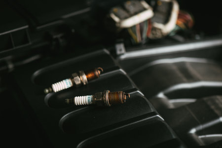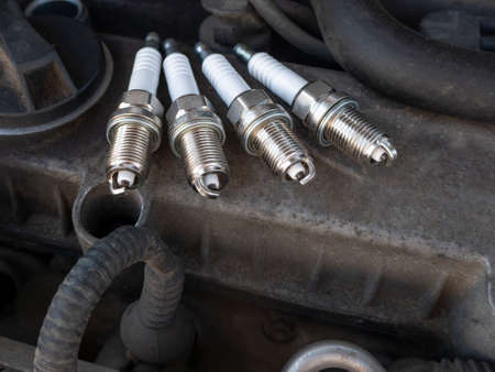 New car spark plugs on engine background