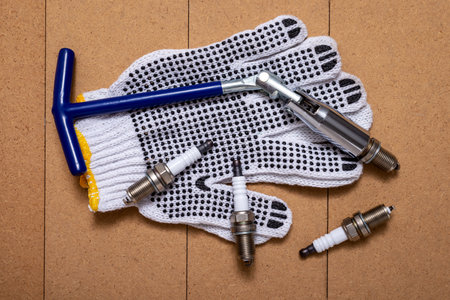 Sparking plugs, spark plug key and protective gloves on wooden table.