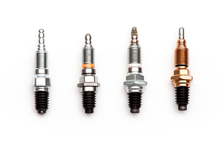 Spark plugs of different types and finishes displayed in a line, highlighting the diversity in automotive components and their applications in vehicles.