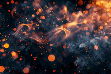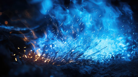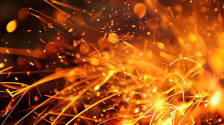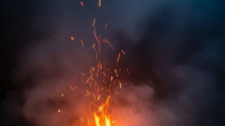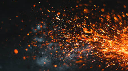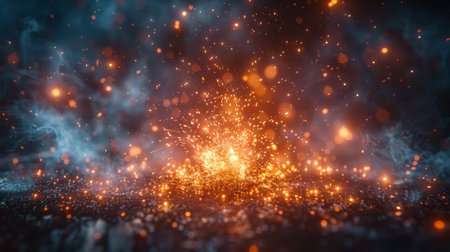 Captivating image showcasing vibrant flames and dancing sparks in a dark setting, creating a mesmerizing atmosphere with glowing elements and smoke.