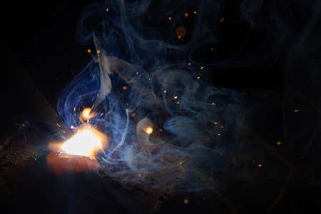Welding spark shower with volumetric smoke. Low angle view of molten metal texture and manufacturing.