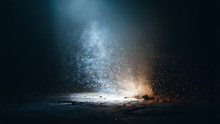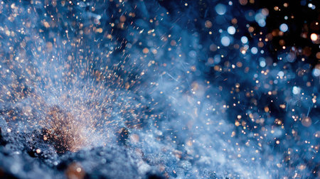 A stunning image capturing a dynamic explosion of glittering particles illuminated by blue light against a dark background, symbolizing motion and energy.