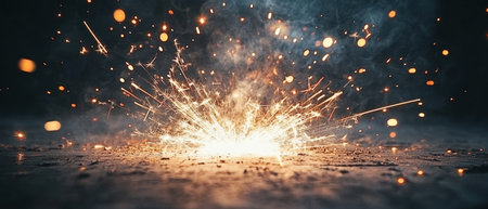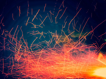 This stunning image captures vibrant sparks emanating from the ground in an industrial setting, creating a mesmerizing interplay of light and color.