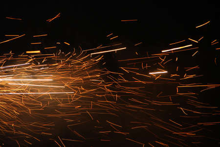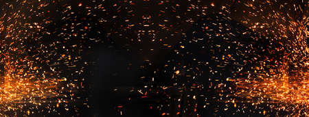 Fiery sparks fly in the air. Abstract background. Glowing sparks in the dark.