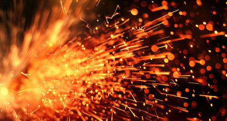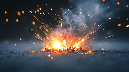 A dramatic image showcasing bright orange sparks erupting from a metal object on a dark surface, capturing the intense energy and dynamic motion of the fire and explosive reaction.