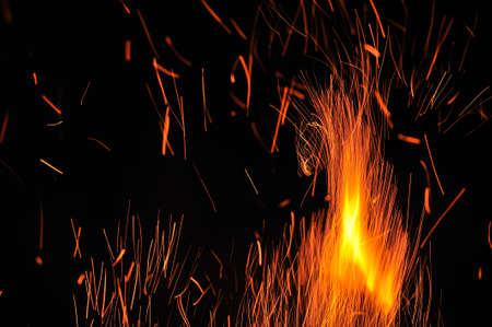 Bright orange and red sparks from a burning fire burst upwards against a dark background, creating a dynamic and energetic display