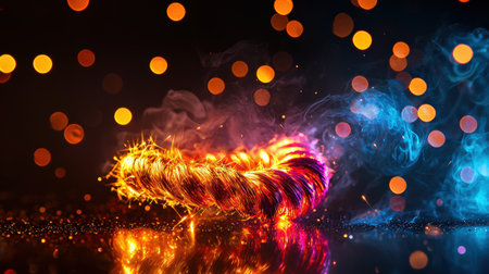 A vibrant firecracker string coiled artistically on a polished surface, accented by subtle sparks and smoke effects